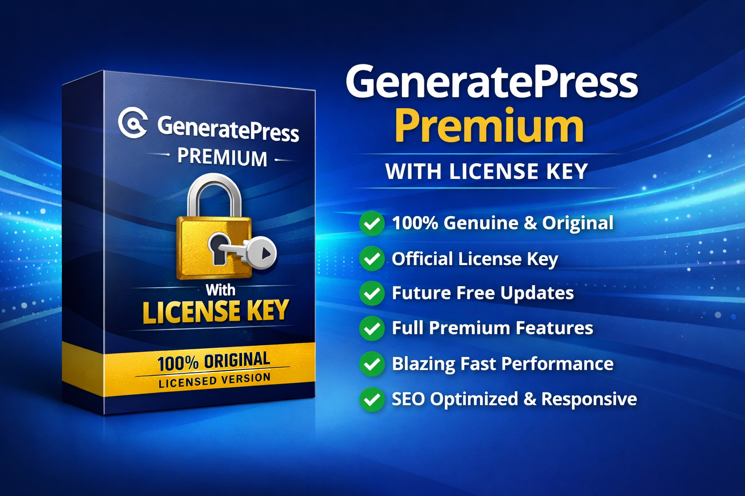 This package includes a valid license key, allowing you to enable premium features and receive theme updates. GeneratePress is known for its clean code, fast loading times, and strong compatibility with major page builders like Elementor and Gutenberg.
